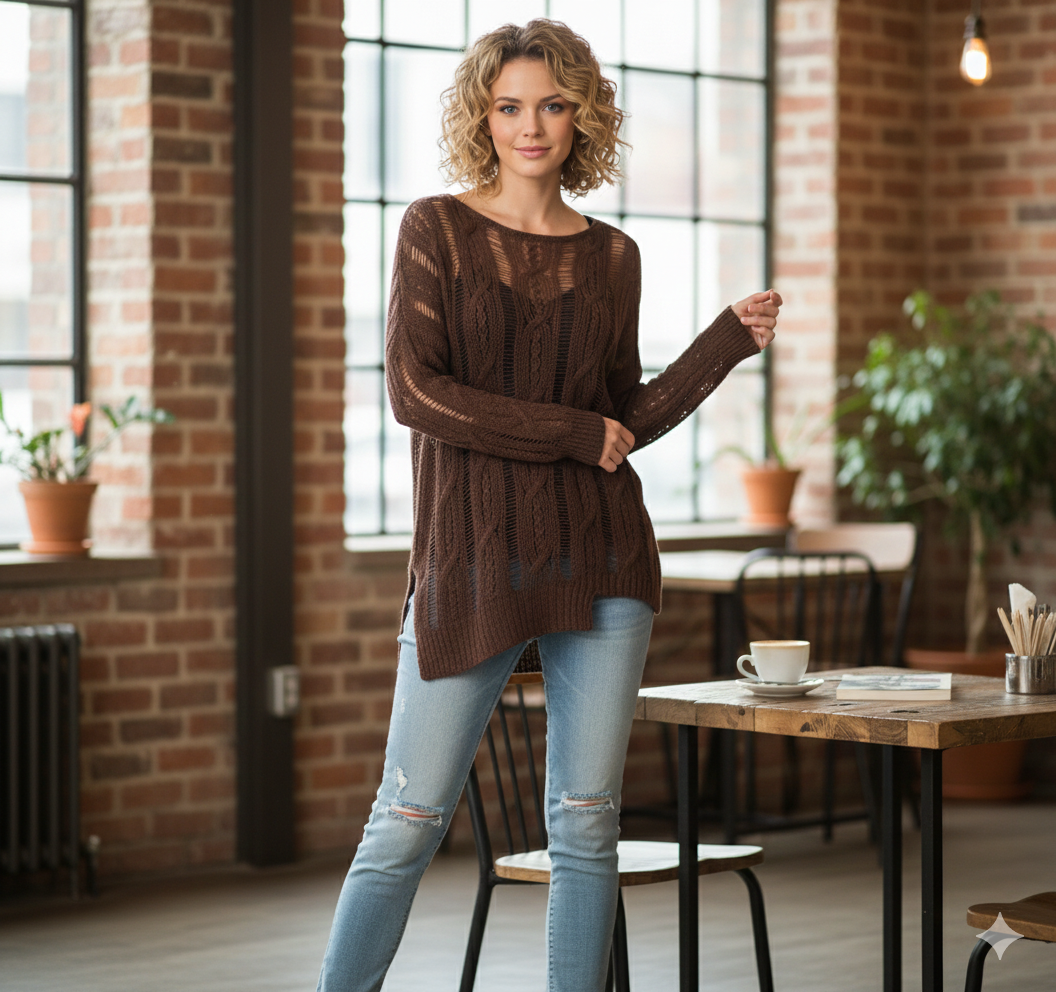 Дамски плетен пуловер с ажурна структура и модерен асиметричен подгъв. Леката и ефирна плетка създава стилен слоест ефект и прави модела подходящ както за ежедневни, така и за по-артистични визии.