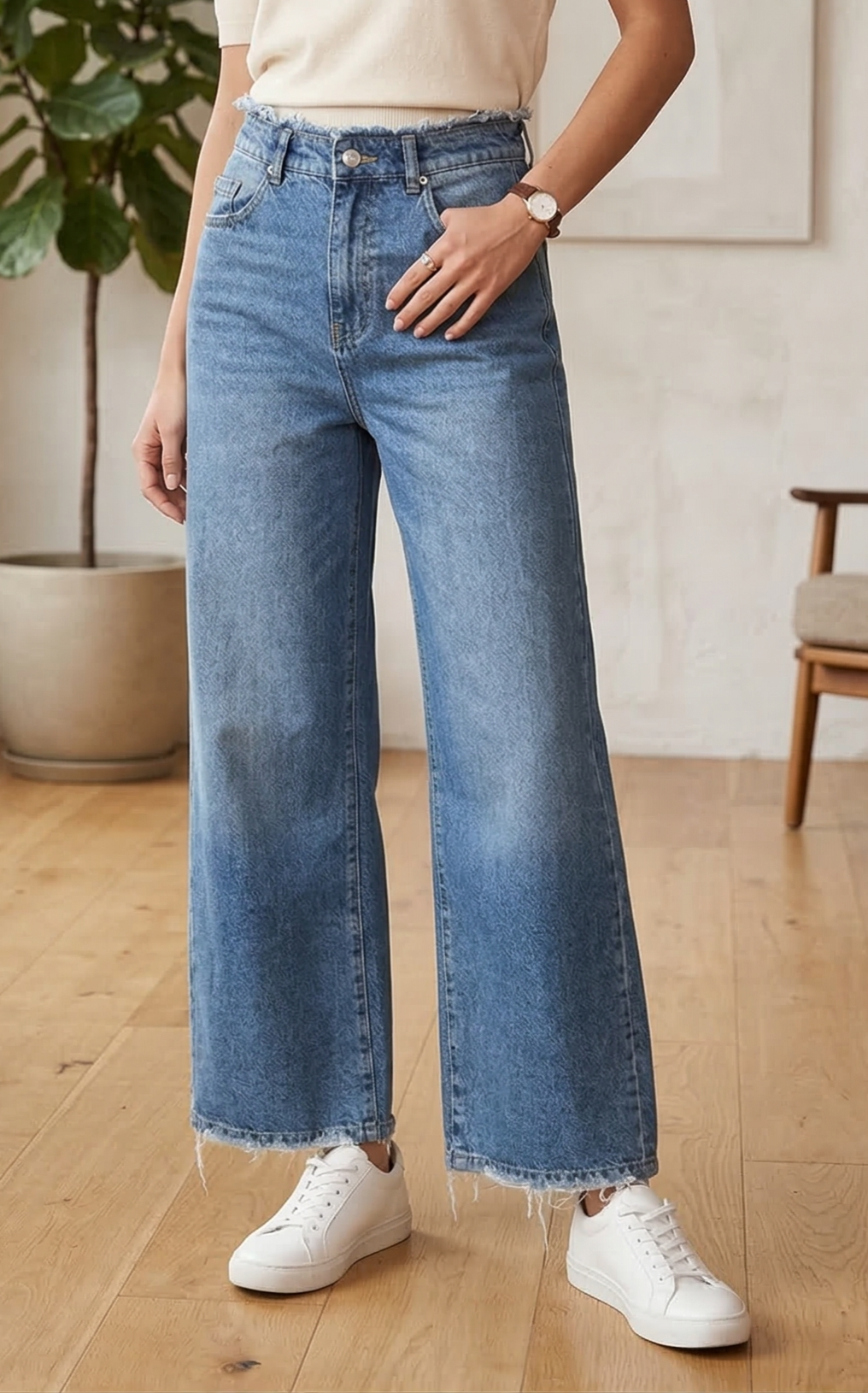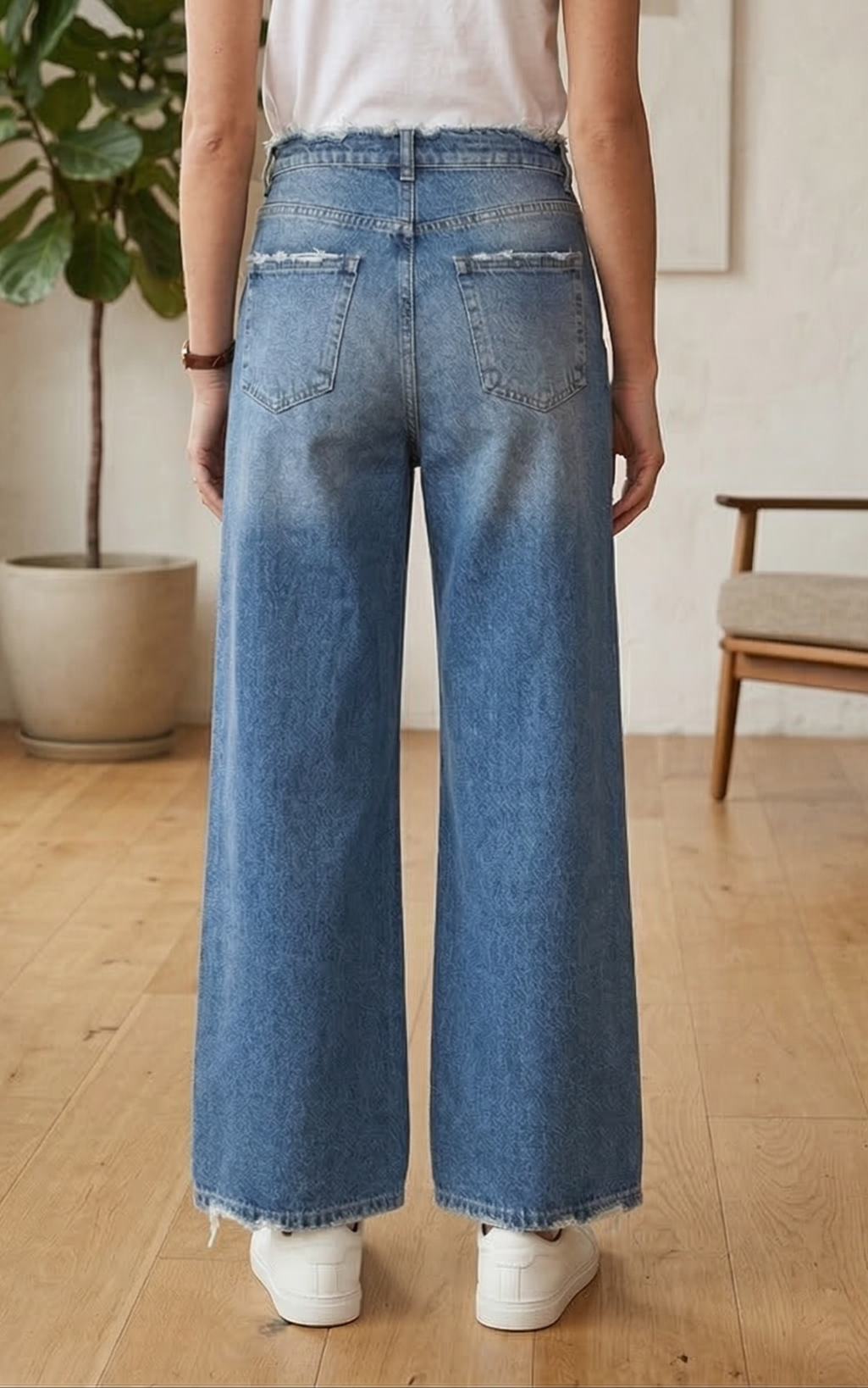 Модерни дамски дънки със свободна кройка и високa талия. Широкият крачол придава стилен и актуален силует. Подходящи за ежедневни и градски визии.